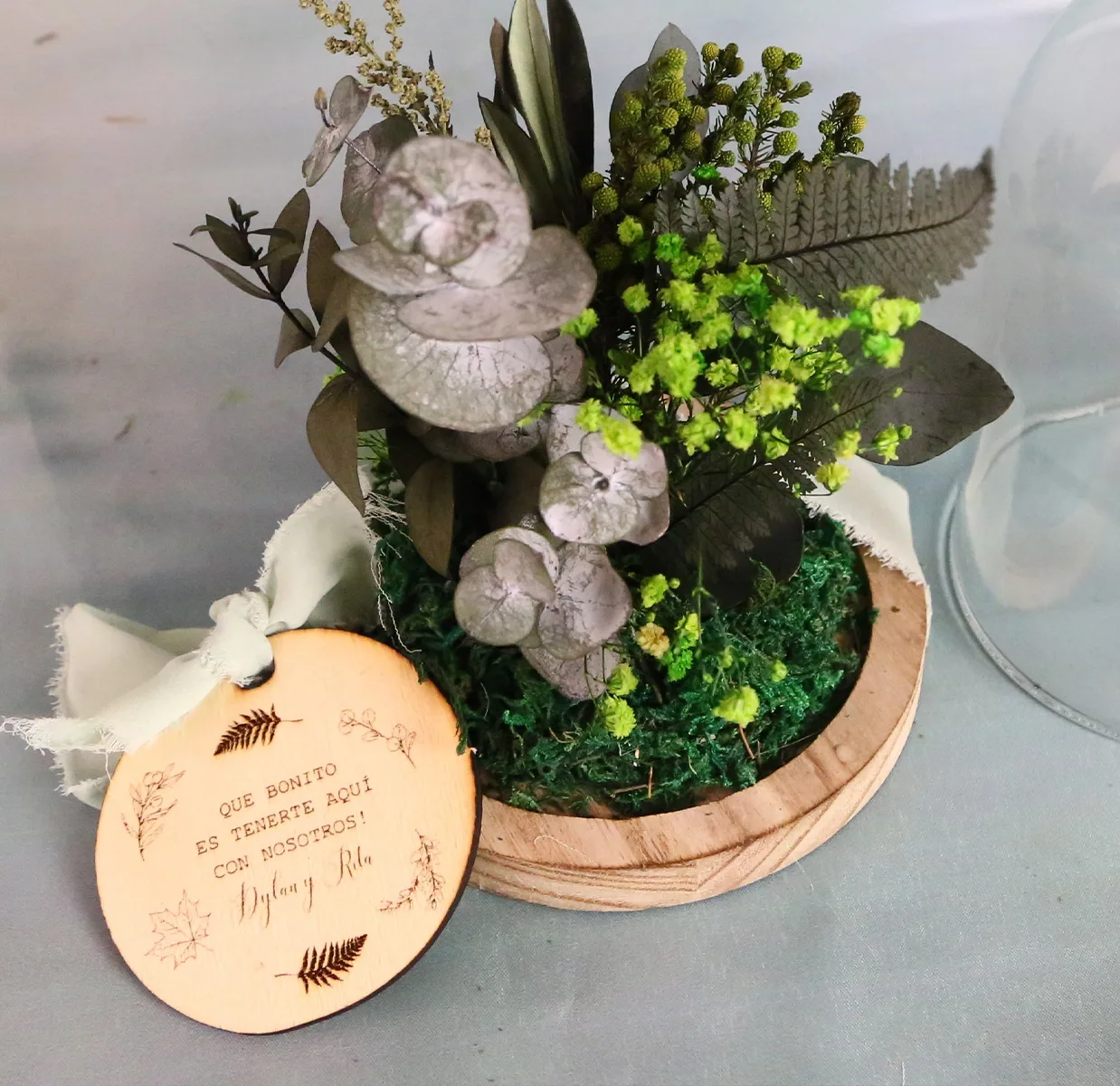 Incluye medalla de madera personalizada con la frase que más te guste y lazo verde a elegir entre terciopelo, cuerda o gasa.