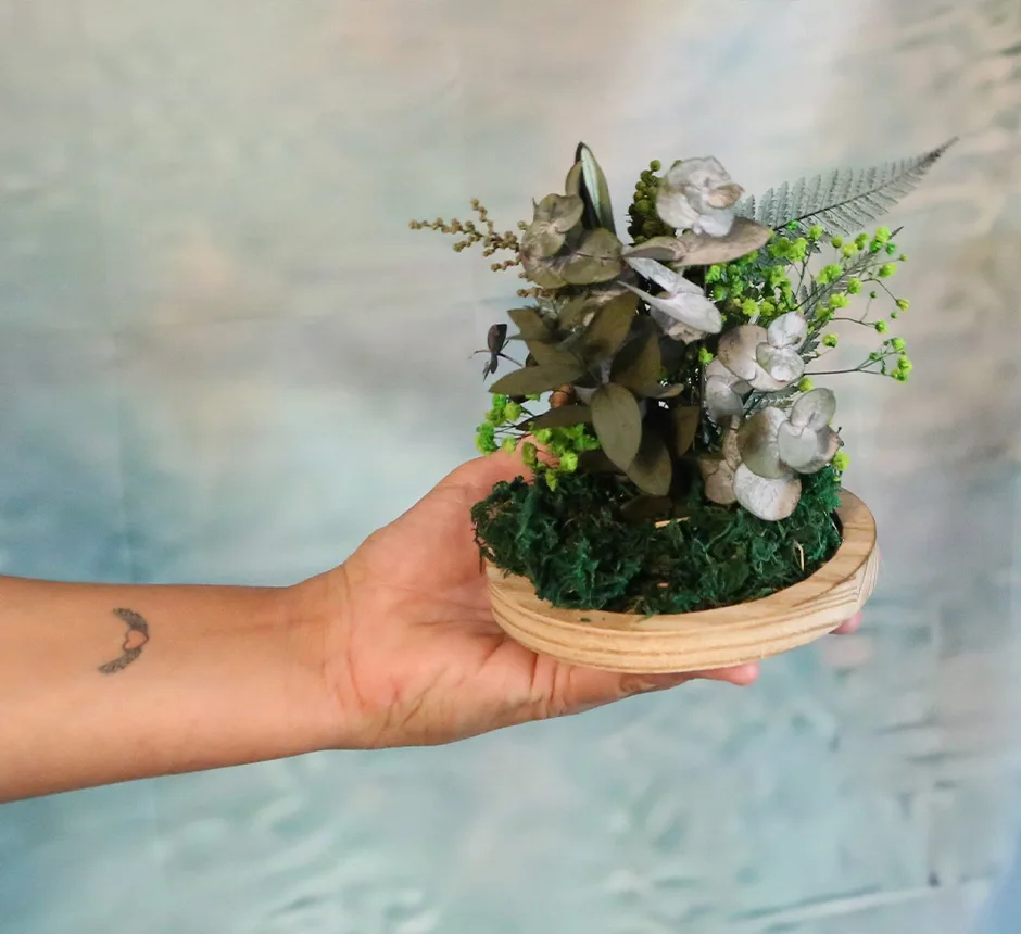 Flores: distintas variedades de eucalipto, paniculata verde, stoebe, olivo, helecho, lanuginosa…
