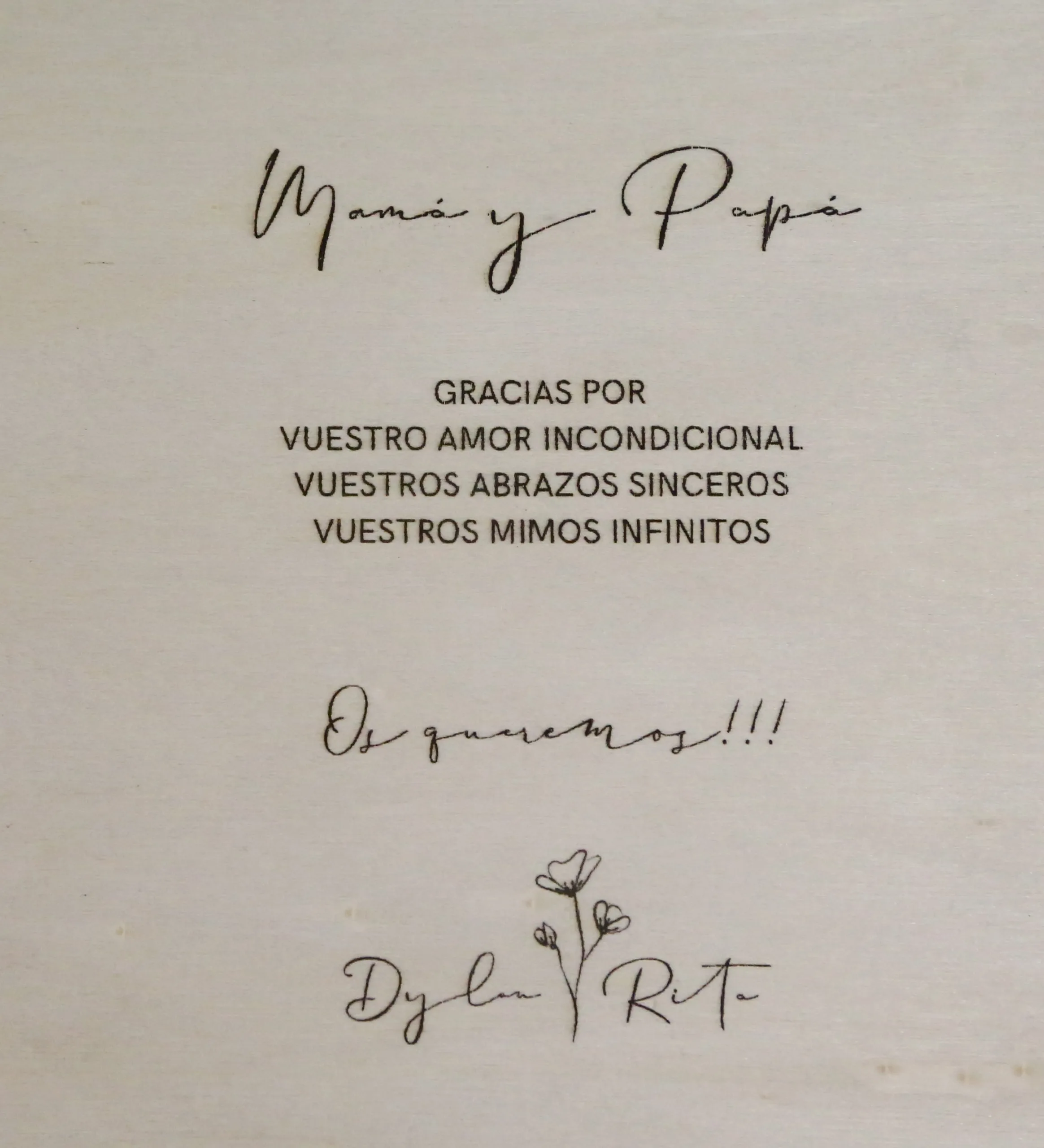 Un regalo pensado para emocionar: un cuadro especial para los padres, acompañado de una pequeña maceta que simboliza el amor que crece cada día. Personalizado con nombres y fechas, e incluyendo un texto grabado a láser, se convierte en un recuerdo único y eterno.