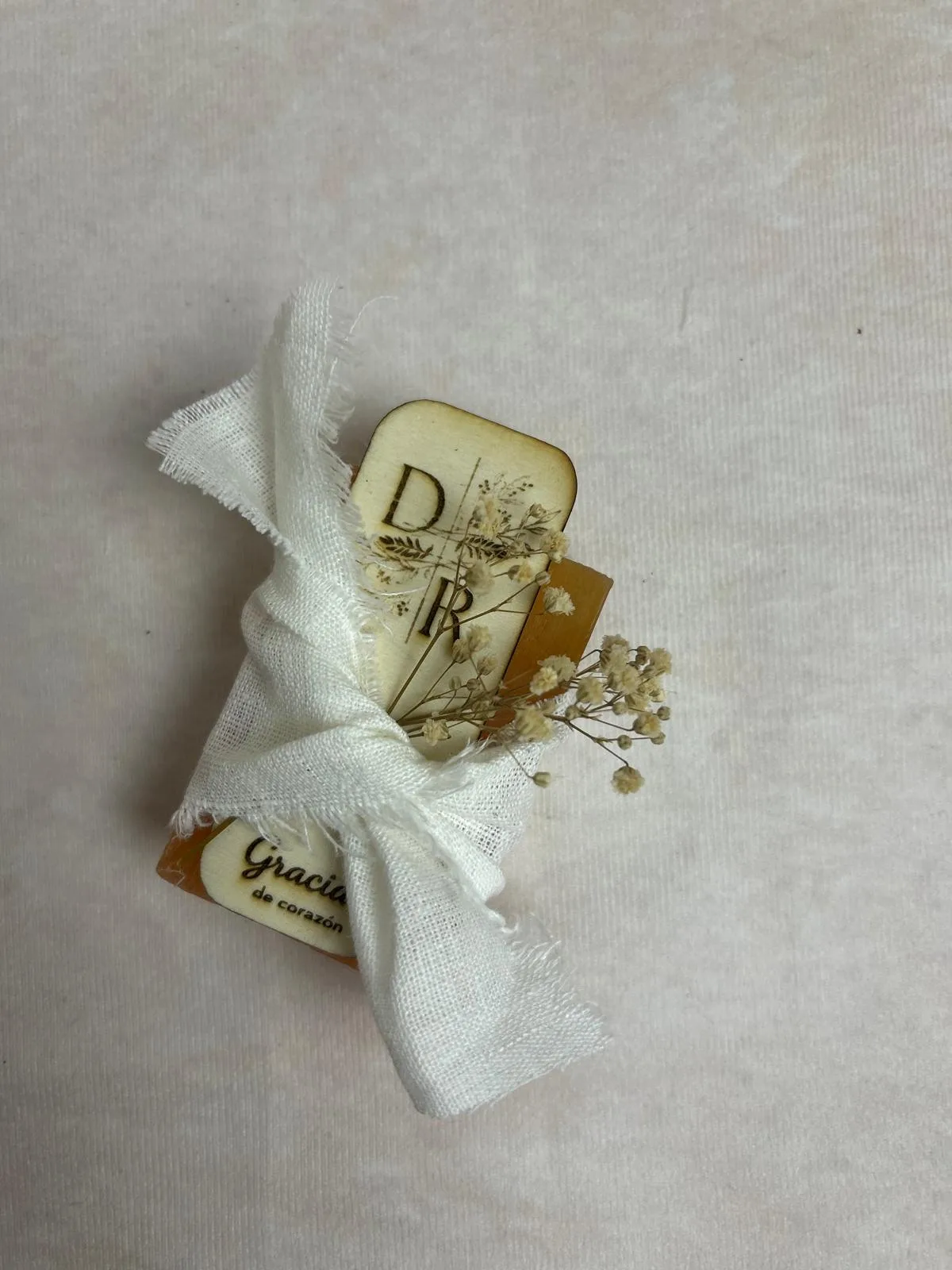 Como elemento distintivo, incorpora una ramita de flores secas blancas que aporta un toque silvestre y muy acorde con la esencia “White Garden”: natural, ligera y sofisticada. Lámina de madera personalizada, grabada con iniciales y un delicado diseño floral que acompaña el conjunto.