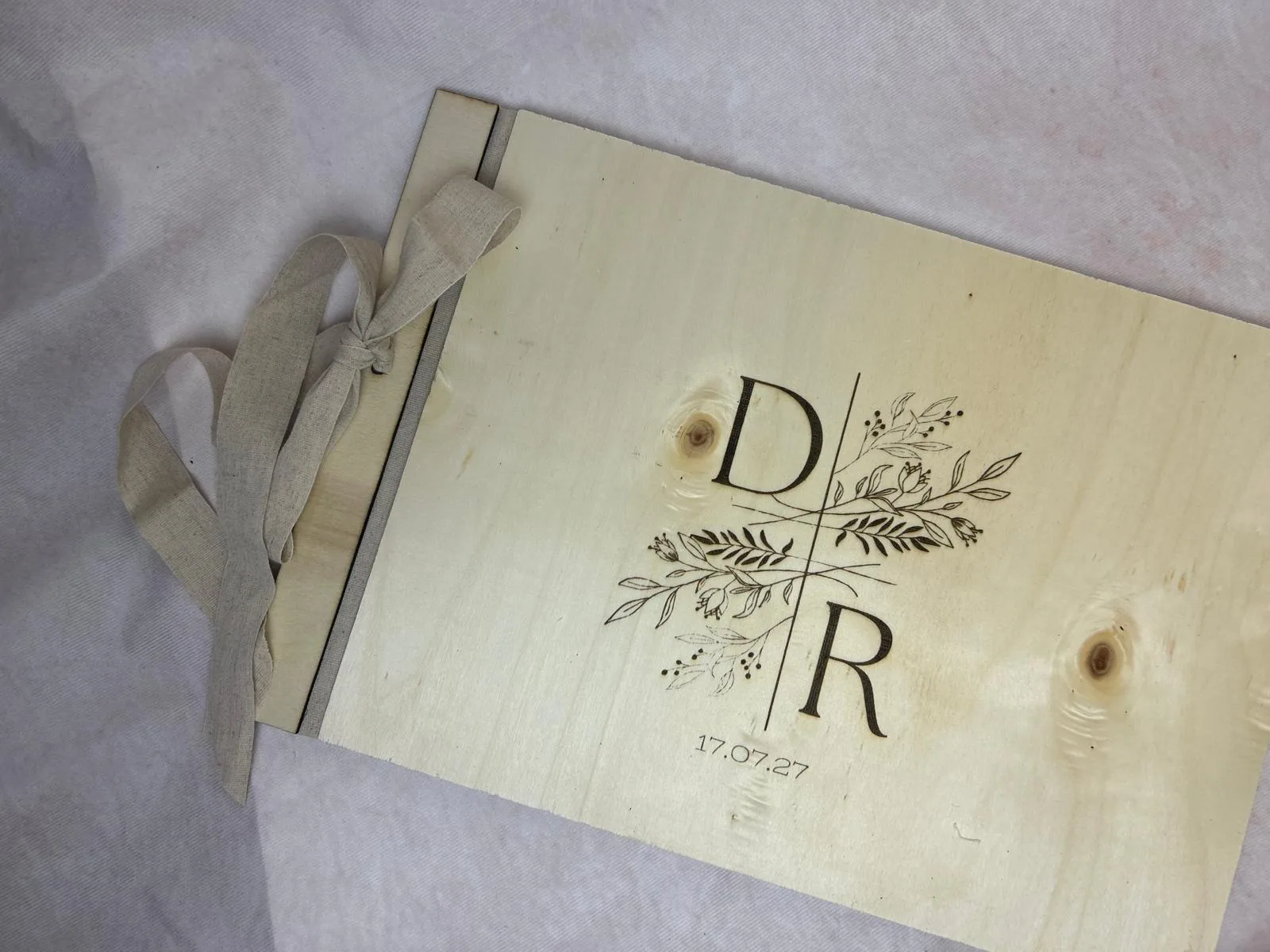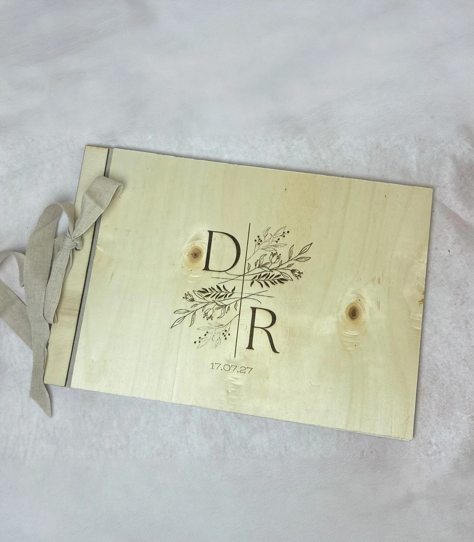 El libro está hecho de madera clara natural, que le dan un aspecto orgánico y artesanal. En el lado izquierdo tiene una encuadernación con cinta de tela beige, atada en un lazo sencillo que refuerza el estilo romántico y campestre.