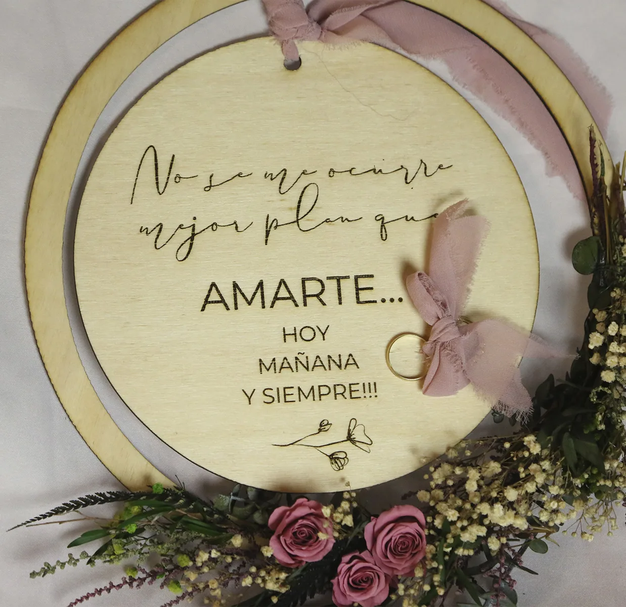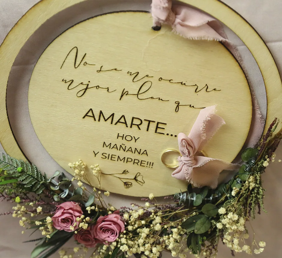 Nuestro bastidor portaalianzas personalizado es el detalle perfecto para acompañar uno de los momentos más especiales de la ceremonia. Con nombres y fecha grabados a láser, se convierte en un recuerdo único y eterno, diseñado para guardar el símbolo de su amor.